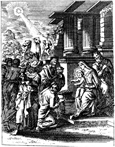 Description: The magi bring the baby Jesus gifts of gold, frankincense, and myrrh. Engraved by John Sturt (1658–1730).