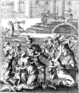 Description: Herod's soldiers murder all the male children two years of age and younger in the vicinity of Bethlehem. Engraved by John Sturt (1658–1730).