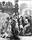 Description: Many enter through the wide gate with music and dancing as few enter through the narrow gate carrying crosses. Engraved by John Sturt (1658–1730).