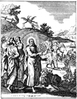 Description: Jesus tells the Parable of the Weeds as the action takes place in the background. Engraved by John Sturt (1658–1730).