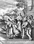 Description: The rich man leaves Jesus, failing to surrender his wealth. Engraved by John Sturt (1658–1730).