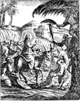 Description: Jesus rides into Jerusalem on a donkey to the waving of palm branches. Engraved by John Sturt (1658–1730).