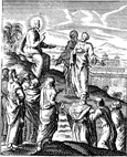 Description: Jesus teaches his disciples about the signs of the end starting with the fall of the temple, depicted in the background. Engraved by John Sturt (1658–1730).