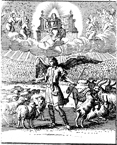 Description: Jesus Christ, with the angels, appears enthroned in the heavens. Below, an angel divides the sheep, representing the saved, from the goats, representing the unsaved. Engraved by John Sturt (1658–1730).