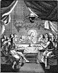 Description: In the evening, Jesus celebrates Passover with his disciples. Engraved by John Sturt (1658–1730).