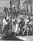 Description: Pilate washes his hands of responsibility as he has his soldiers lead Jesus away to be crucified. Engraved by John Sturt (1658–1730).