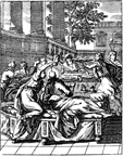 Description: A woman anoints Jesus' feet with perfume while he eats at the home of Simon the Leper in Bethany. Engraved by John Sturt (1658–1730).