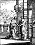 Description: Mary visits her cousin Elizabeth after finding out they are both pregnant. Engraved by John Sturt (1658–1730).