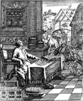 Description: The rich fool plans to build a bigger barn, not realizing that he will die that night. Engraved by John Sturt (1658–1730).