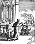 Description: A rich man invites the poor, blind, lame, and crippled to a feast after the original guests decline the invitation. Engraved by John Sturt (1658–1730).