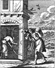 Description: A woman searches her house for a lost coin, while a shepherd brings a lost sheep home. Engraved by John Sturt (1658–1730).