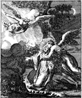 Description: Jesus prays in the Garden of Gethsemane as angels minister to him. Engraved by John Sturt (1658–1730).