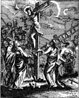 Description: Jesus hangs on the cross under a darkened sky. Mary and the other women, and John, the beloved disciple, look on. Engraved by John Sturt (1658–1730).