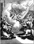 Description: On Pentecost, the Holy Spirit descends upon the believers in the form of a dove. Engraved by John Sturt (1658–1730).