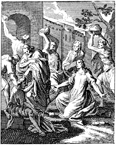 Description: Garments are placed at the young Saul's feet as the deacon Stephen is stoned. Engraved by John Sturt (1658–1730).