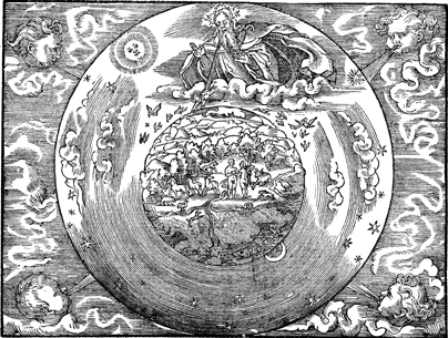 Description: God creates the world, while the infant Jesus proceeds from God carrying a cross toward earth.