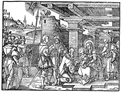 Description: The magi bring gifts of gold, frankincense, and myrrh to the newborn king.