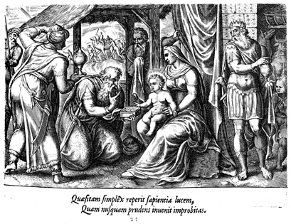 Description: The magi come to Bethlehem following a star with gifts of gold, frankincense, and myrrh for the baby Jesus. Plates in this volume were engraved by Philippe Galle (1537-1612) and Jan Wierix (16th c.) after drawings by Gerard P. Groenning (16th c.).