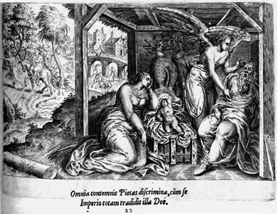 Description: An angel warns Joseph in a dream of Herod’s intent to kill the baby Jesus (Matthew 2:13), urging him to flee to Egypt with Mary and the baby. Plates in this volume were engraved by Philippe Galle (1537-1612) and Jan Wierix (16th c.) after drawings by Gerard P. Groenning (16th c.).