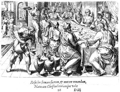 Description: Jesus turns water into wine at a wedding celebration in Cana. Plates in this volume were engraved by Philippe Galle (1537-1612) and Jan Wierix (16th c.) after drawings by Gerard P. Groenning (16th c.).