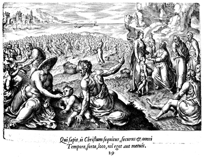 Description: Jesus feeds the 5,000 with five loaves of bread and two fish. Plates in this volume were engraved by Philippe Galle (1537-1612) and Jan Wierix (16th c.) after drawings by Gerard P. Groenning (16th c.).