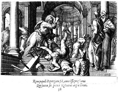 Description: Jesus entered the Temple and began to drive out all the people buying and selling animals for sacrifice. He knocked over the tables of the money changers and the chairs of those selling doves. Plates in this volume were engraved by Philippe Galle (1537-1612) and Jan Wierix (16th c.) after drawings by Gerard P. Groenning (16th c.).