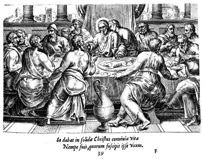 Description: Jesus celebrates Passover, or the Last Supper, with the Apostles. Plates in this volume were engraved by Philippe Galle (1537-1612) and Jan Wierix (16th c.) after drawings by Gerard P. Groenning (16th c.).