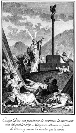 Description: Moses provides a bronze serpent so that whoever looks upon it may survive the venomous snake bites. The engraver’s name is located at the lower right corner.