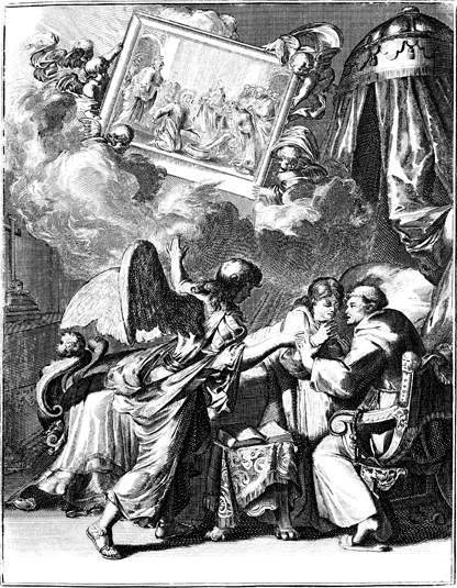 Description: A sick or dying man is shown imagery from the Bible as he lays in bed, attended by holy men. The scene depicted is Jesus washing Peter.