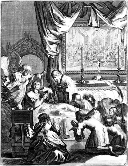 Description: A sick or dying man is shown imagery from the Bible as he lays in bed, attended by holy men. The scene is the Last Supper.