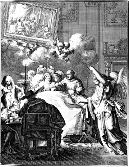 Description: A sick or dying man is shown imagery from the Bible as he lays in bed, attended by holy men. In this image Jesus bids his disciples farewell before his crucifixion.