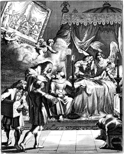 Description: A sick or dying man is shown imagery from the Bible as he lays in bed, attended by holy men. The scene is of Jesus giving his Kingdom to the Disciples.