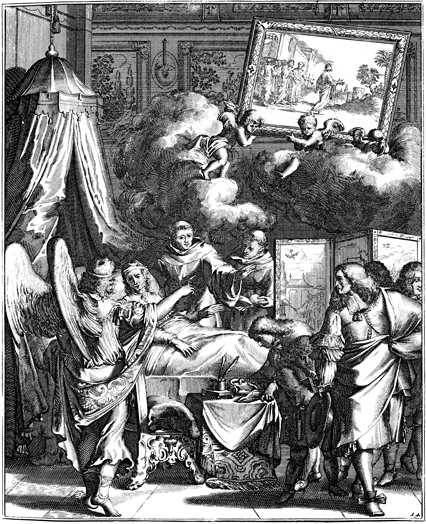 Description: A sick or dying man is shown imagery from the Bible as he lays in bed, attended by holy men. The scene is Jesus and the Disciples moving towards the Garden of Gethsemane.