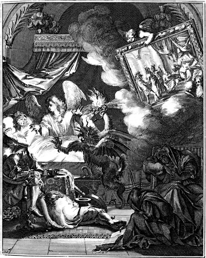Description: A sick or dying man is shown imagery from the Bible as he lays in bed, attended by an angel and a demon while his attendants sleep. The scene depicts Jesus standing before Caiaphas.