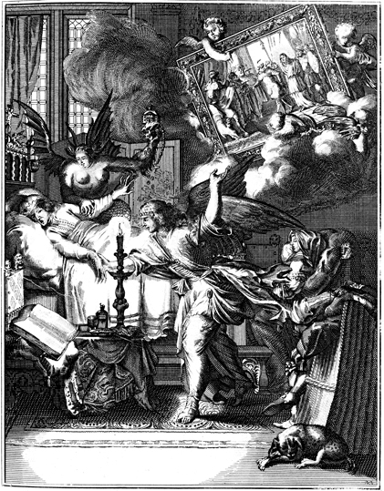 Description: A sick or dying man is shown imagery from the Bible as he lays in bed, attended by an angel and a demon. The scene depicts Jesus being shown to Pontius Pilate.
