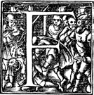 Description: An initial letter F with a group of men, one of whom is holding a sword.