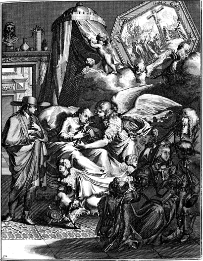 Description: A sick or dying man is shown imagery from the Bible as he lays in bed, attended by holy men. The scene depicts Jesus' crucifixion.