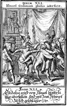 Description: Gedaliah, appointed governor of Judah by the Babylonian king, is slain with his Jewish associates and Babylonian soldiers by Ishmael and his army.
