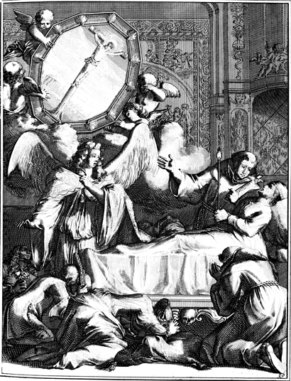Description: A sick or dying man is shown imagery from the Bible as he lays in bed, attended by holy men. The scene depicts Jesus' death on the cross.