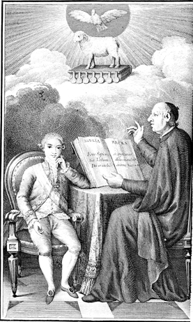 Description: The young Prince of Asturias, heir to the Spanish throne, sits on the left and is taught the Bible by a Cardinal. At the head of the image a dove, representing the Holy Spirit, flies above a lamb which stands on a book with seven seals. The engraver’s name is located at the lower right corner.