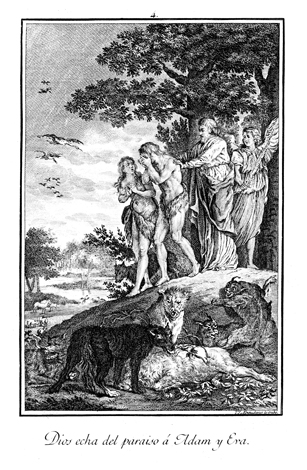 Description: Adam and Eve are expelled from the Garden of Eden by God, and an angel with a flaming sword is placed to guard the entrance. The engraver’s name is located at the lower right corner.