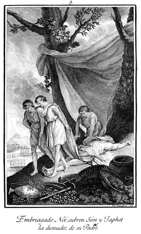 Description: Ham dishonors Noah by pointing out his nakedness, but Shem and Japheth cover their father with a sheet. The engraver’s name is located at the lower right corner.