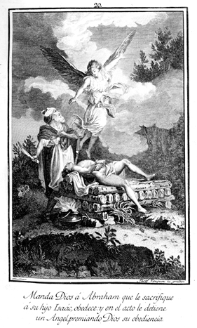 Description: After witnessing Abraham’s faith, an angel prevents him from sacrificing his son Isaac to God and supplies a ram instead for the sacrifice. The engraver’s name is located at the lower right corner.