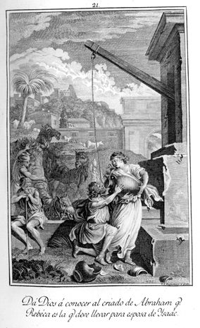 Description: Rebekah serves water to Abraham's chief servant and camels, showing that she is God's chosen wife for Isaac. The engraver’s name is located at the lower right corner.