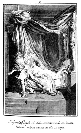 Description: As Potiphar’s wife attempts to seduce Joseph, he flees and leaves his cloak in her hands. The engraver’s name is located at the lower right corner.