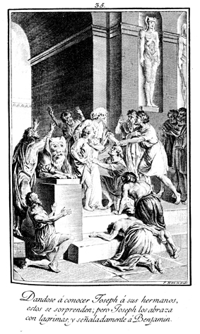Description: Joseph embraces Benjamin, while his other brothers are filled with great wonder and fear after discovering he is still alive. The engraver’s name is located at the lower right corner.