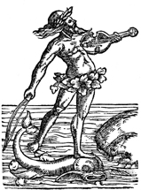 Description: This printer's device of Joannes Oporinus (1507-1568) alludes to the myth of Arion, the musician, being rescued by the dolphin.