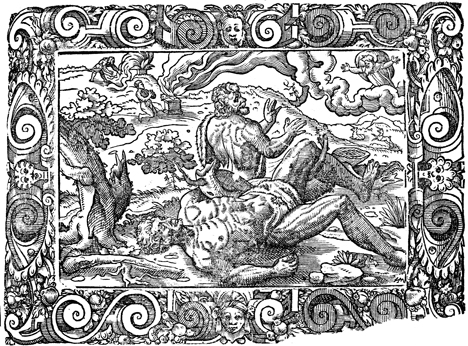 Description: Cain murders Abel (foreground) after God accepts Abel's sacrifice over his own (background).