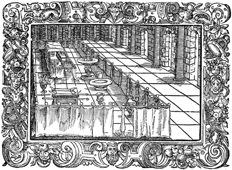 Description: The interior of the court of the tabernacle. Inside the courtyard is the altar of burnt offering, the bronze laver, and the Holy of Holies.