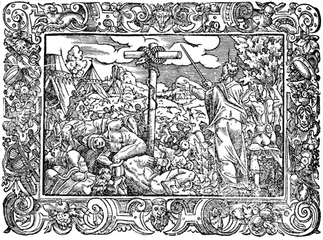 Description: Moses provides a bronze serpent that whoever looks upon it may live from the venomous snake bites.